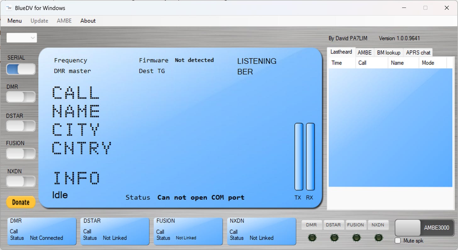 I did install BlueDV for Windows on the Surface Laptop 7 but I can’t use it without functioning ZUMspot-USB drivers. This was not a wasted effort as I noted that M17 is not present in the BlueDV interface.