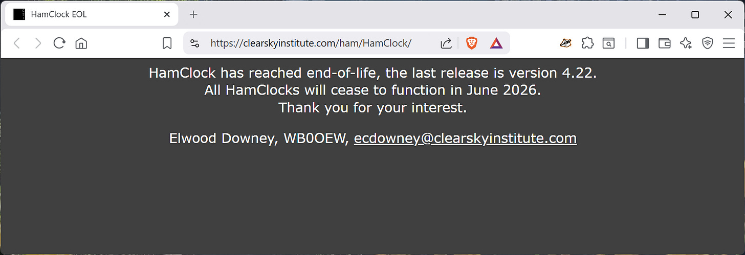The crisis is an end-of-life notice for HamClock. My guess is the software “phones home” to do things like DX spotting and that system (translation: that server) is going to go dark. But that is a guess on my part. You might find more information in an active Reddit conversation by the time this issue publishes.