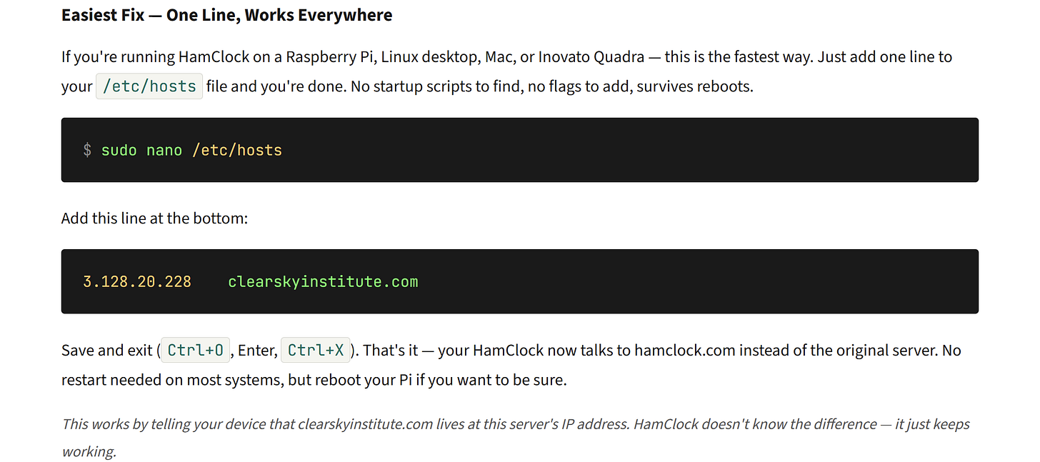 I’m not trying to feed the dragon here. Please use your best judgment in choosing a service that helps you continue using your legacy HamClock. Me? I’ve switched to OHB and it looks fine: