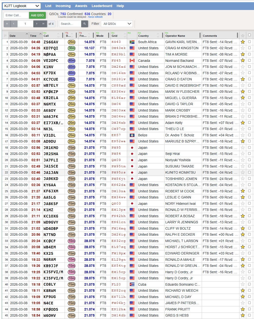 On Sunday, I spent some time working FT8 stations on 10, 15, 20, 30, and 40 meters. I picked up two new countries: Belize and South Africa. I guess the system is working! (The yellow star in the right column means the contact is confirmed.)